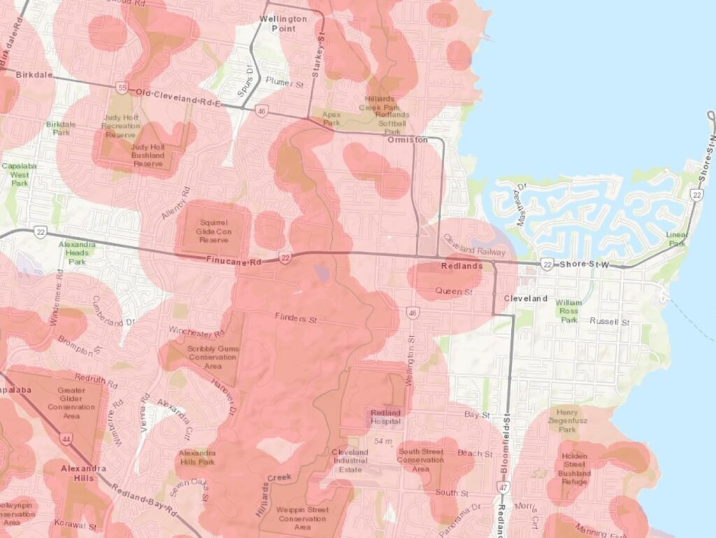 The QFD Postcode Checker map. Dark pink: indicates proximity to an area that could be at risk of a dangerous fire. Light pink: Communities in these locations should be aware they are close to areas that could be at risk of a dangerous fire.